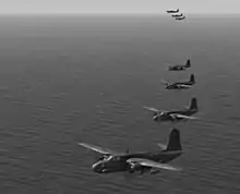 The first full scale practice was held on 17 November.[8] The Ventura crews soon learned that the backwash off the paddled blades of the other Venturas made their planes liable to skid and difficult to control; flying so low left no time for recovery. Any mistake they made could quickly lead to them flying into the North Sea or the ground. The pilot had to be very attentive to stay on station, focused on the wing or tail of the aircraft before him. The lead pilot had to be aware of the trailing aircraft, accounting for their position with each manoeuvre he made. While flying low over Holland the pilots and navigators would have to keep a sharp eye out for obstructions. Birds on the coast tended to be larger, and when startled by the noise of an aircraft engine they would take off into the air. The risk of bird strikes was one of 2 Group's greatest dangers.[9]