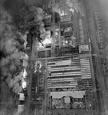 Following both groups were the Venturas, carrying their incendiaries in for a low level attack at Zero plus 6. As they brought up the rear, there was no problem finding the direction to the target, as smoke billowed into the air. The smoke obscured the buildings and made it difficult to avoid obstructions. As the Venturas began releasing their incendiaries the fires accelerated and visibility got worse. A number of pilots strained to get their aircraft up over the structures.[55] One of the Venturas attacking the Strijp complex was and flew into a cloud of smoke, into a building and exploded.[28] Fire, smoke and aircraft filled the air. Another Ventura was seen to be hit, catch fire and fly straight through a Dutch house, erupting in a fiery explosion as it came out the other side. Another was seen by a following aircraft to deliver its incendiaries, only to have some of the phosphorus splatter onto its tail and set it on fire; the aircraft dived into the earth and exploded.[24] The Venturas were bombing but were suffering higher losses. Pilot Stephen Roche noted "The flak and machine-gun fire were terrific, and once we bombed it was every man to himself".[56] German gunners on roof tops were seen to fire their guns as the buildings they were standing on burned underneath them or exploded; several other Venturas were lost in the attack.[57] Having released their bombs, the aircraft dived to ground level and hedge-hopped for home.