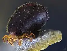 Ophionyssus natricis, the reptile mite, is a parasitic mite most commonly found on snakes, but also occurring on captive lizards, turtles, crocodiles, and other reptiles.[1] The parasites feed on snakes, which cause the bodies of the mites to be engorged with blood and fluids from the snake. Once the mites feed by puncturing through the snake skin, the snake usually shows symptoms of irritation and discomfort. The involvement of snake mites in transmission of infectious illnesses like inclusion body disease and ophidian paramyxovirus remains controversial. Human infestation has been reported.[2]