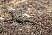 Madagascar spotted spiny-tailed iguana lives on loamy slopes, clay expanses and large rocks in various environment, from the arid regions in dry spiny forests to northern wetlands and humid areas close to the rainforest and in shrubland.