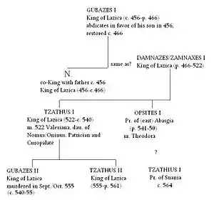 In one passage, Procopius remarks parenthetically that Opsites was an uncle of Gubazes II of Lazica and at one time king of the Lazi: "[This Persian general]...captured Theodora, the consort of Opsites (he was uncle of Gobazes and king of the Lazi), finding her among the Apsilii, and carried her off to the land of the Persians. Now this woman happened to be a Roman by birth, for the kings of the Lazi from ancient times had been sending to Byzantium, and, with the consent of the emperor, arranging marriages with some of the senators and taking home their wives from there" [2]