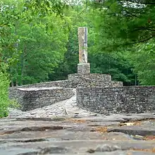 Fite, then a professor of sculpture and theater at Bard College, Annandale-on-Hudson, New York, purchased the disused quarry site in 1938, expecting to use it as a source of raw stone for his representational sculpture. Instead, inspired by a season of work restoring Mayan ruins in Honduras, he began creating a space to display the large carved statues he was beginning to create out of native bluestone.[2] Using the rubble that had been left behind as the area was quarried, he built terraces, ramps and walkways to lead to the individual works, doing all the work by hand, and using the traditional hand tools that had been used by the local quarrymen before him. As the rampwork of his open-air gallery expanded, Fite realized that the 1.5-ton (1.36 metric ton) statue, Flame, which had occupied the central pedestal, had become too small for the scale to which his work had grown, and he replaced it with a 9.5-ton bluestone pillar he had found in a nearby streambed, intent on carving it in place as his tallest bluestone sculpture to date. Fite erected the focal monolith in 1962, 23 years after he had begun work on his quarry gallery.