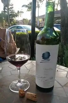 Opus One Winery is a winery in Oakville, California, United States. The wine was called napamedoc until 1982 when it was named Opus One. The winery was founded as a joint venture between Baron Philippe de Rothschild of Château Mouton Rothschild and Robert Mondavi to create a single Bordeaux style blend based upon Napa Valley Cabernet Sauvignon. It is located across State Route 29 from the Robert Mondavi Winery. The creation of this winery venture in 1980[1] was big news in the wine industry; de Rothschild's involvement added an air of respectability to the burgeoning Napa wine region. The first vintage, 1979 was released in 1984 at the same time as the 1980 vintage. For a while it was the most expensive Californian wine, and to date still ranks among the most expensive red wines produced in the Napa Valley, with the 2014 vintage retailing for $325 per bottle.[2] In 1989 a new winery was built just down the road, the first vintage from the new winery was from 1991 and was released in 1994.[3]