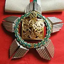 The star of the order is five-pointed, 80mm in diameter. In the centre there is a similar medallion to that on the badge. Awardees also receive a miniature star to wear as a lapel badge.