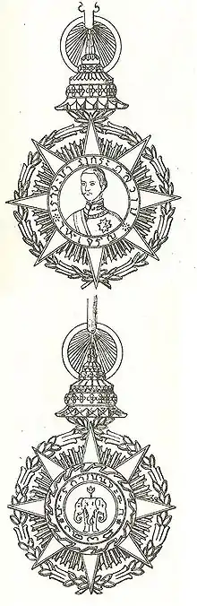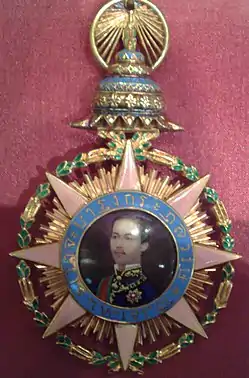 - Insignia consists of a pendant only. The pendant design is similar to that for a Knight Commander, but of smaller size. It is suspended from a pink silk band 4 cm wide, with an additional rosette, to wear on the left chest.