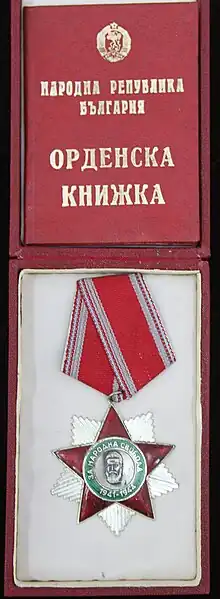The Order of People's Liberty was an Order of Merit of the Kingdom of Bulgaria from 1945 to 1946, and of the People's Republic of Bulgaria from 1946 to 1990. Originally it consisted of simply a breast star, but later became issued as a breast badge.[1]