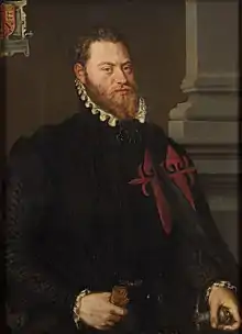 The Order's insignia is said to originate from the Battle of Clavijo, and is a red cross resembling a sword, with the shape of a fleur-de-lis on the hilt and the arms.[3] The knights wore the cross stamped on the royal standard and white cape. The cross of the royal standard had a Mediterranean scallop in the center and another one at the end of each arm.[4]