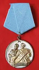 Awarded to low rank soldiers for exceptional actions in the face of remarkable danger. The second class of this award differs only from the first class by the way of the first class having an additional ribbon sewn across the ribbon suspension. | ||