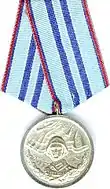 Awarded to personnel of the troops of the Ministry of Transport of the People's Republic of Bulgaria for merits. This medal is exactly the same in design as the For Merit in the Railway Troops of the People's Republic of Bulgaria award it replaced when the department changed its name. | ||