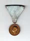 This was awarded without crown/reef above the medal. There are 6 variations of the obverse, Knjaz Alexander, Knjaz Ferdinand, Tsar Ferdinand I, Tsar Boris III, Tsar Boris III (With "A" missing from Bulgaria) and a regent coat of arms. If awarded during periods of war (14–28 November 1885, 8 October 1912 – 30 May 1913, 29 June – 31 July 1913, 14 October 1918 – 29 September 1918 and 1 March 1941 – 9 May 1945) this medal was issued with an alternate war time ribbon. All of these factors together make a great many different variations of this award. | |||