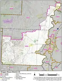 District 23 of the Oregon House of Representatives is one of 60 House legislative districts in the state of Oregon. As of 2021, the boundary for the district includes portions of Polk and Yamhill counties. The district includes Dallas, Falls City, Oregon, Dayton, Oregon, Dundee, and Newberg as well as parts of Amity. The district is currently represented by Anna Scharf of Amity, who was appointed on July 12, 2021, after its former Representative Mike Nearman was expelled from office.