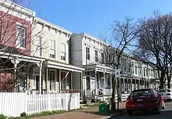 Important Quakers who lived in the Oregon Hill neighborhood included Robert Pleasants,[5] and later Samuel Pleasants Parsons, who became superintendent of the Virginia Penitentiary, which once stood on Belvidere Street. As General Superintendent of the canal company, Parsons oversaw its expansion to Lynchburg, Virginia.[6] In 1817, the Harvie family, which owned most of the neighborhood, subdivided it into lots, which were sold to blacks as well as whites. The Baker House, built by a "free person of color" on Belvidere Street circa 1850, was moved in the 1920s to 617 Cherry Street.[7] The neighborhood's name refers to quips that employees moving there to be close to their workplace might as well be moving westward to Oregon. The Tredegar Iron Works and Albemarle Paper Company became major employers by the 1850s. In 1849, the Hollywood Cemetery was developed from what had been known as Harvie's Woods at the edge of the neighborhood.