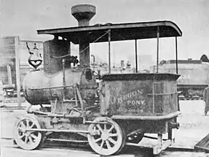 The Oregon Pony was the first steam locomotive to be built on the Pacific Coast and the first to be used in the Oregon Territory.[1] The locomotive, a gear-driven steam 5' gauge locomotive with 9"X18" cylinders and 34" drivers,[2] was used in the early 1860s to portage steamboat passengers and goods past the Cascades Rapids, a dangerous stretch of the Columbia River now drowned by the Bonneville Dam. Steamboats provided transportation on the Columbia between Portland, Oregon and mining areas in Idaho and the Columbia Plateau. Portage was also necessary at other Columbia River navigation obstructions, including Celilo Falls.[3]