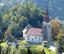 The parish church in the settlement is dedicated to Saint Ubald and belongs to the Koper Diocese.[5] It was built in 1755 and is a Baroque structure with a polygonal chancel walled on three sides, a wider rectangular nave, and a bell tower. The interior is barrel-vaulted and the furnishings date from the 19th century.[6]