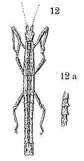 - ↑ Zompro, O. (2004). Revision of the genera of the Areolatae, including the status of Timema and Agathemera (Insecta, Phasmatodea), Goecke & Evers, Keltern-Weiler, pp. 221–223, ISBN 978-3931374396