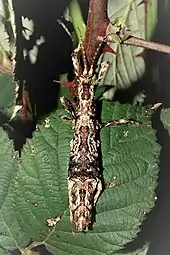 Like all members of the genus, the insects are nocturnal and hide during the day. If they are touched or fall to the ground, they put their legs close to the body and align the antennae lengthways to the body, making them resemble a short, broken branch (phytomimesis). The individually deposited brown eggs are 3.6 millimetres (0.14 in) long, 2.7 millimetres (0.11 in) wide, 2.5 millimetres (0.098 in) high and have 0.3 millimetres (0.012 in) long hair on the egg capsule and lid.[1]