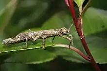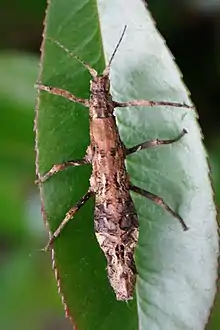 The nocturnal animals, like all members of the genus, are able to achieve an almost perfect phytomimesis by aligning legs and antennae along the body and so hardly from a short broken branch are to be distinguished. The individually laid brown eggs are 3.5 millimetres (0.14 in) long, 2.9 millimetres (0.11 in) wide, 3.2 millimetres (0.13 in) high and have 0.3 millimetres (0.012 in) long hairs on the egg capsule and lid.[1]