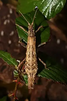 The females are 40 to 50 millimetres (1.6 to 2.0 in) long and stocky in shape. Their basic color is usually a light beige or brown, which is complemented by almost white, brown and black patterns. The body surface is covered with small, mostly black tubercles.[3] In the middle of the otherwise flat upper side of the thorax a weak carina can be seen. The comparatively short mesonotum is 2.5 times as long as the pronotum and thus significantly shorter than in longer species such as Orestes mouhotii or Orestes shirakii.[4] On the forehead that becomes narrower towards the top, the four elevations form two edges that converge towards the tip of the forehead, which when viewed from the front form a triangle. The abdomen becomes significantly wider up to the middle and is also strongly raised laterally up to the middle in egg-laying females. Tubercles can be found on the posterior lateral area of the third to fifth tergite of the abdomen other species is missing in the females of Orestes guangxiensis.[5]