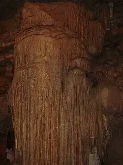 In 1973, the Organ Cave System—also known as the Organ–Hedricks Cave System[2]—was registered as a National Natural Landmark for being "the largest cave system in the State, containing many caves, one of which is Organ Cave.[3] Noted also for its saltpeter troughs and vats." (It is now the third-longest known cave in the state, after the Friars Hole Cave System in the same county and the Hellhole System in Pendleton County.[4]) Organ Cave has also been listed on the National Register of Historic Places since 2005.[5]