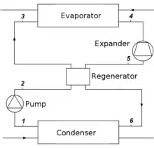 The working principle of the organic Rankine cycle is the same as that of the Rankine cycle: the working fluid is pumped to a boiler where it is evaporated, passed through an expansion device (turbine,[3] screw,[4] scroll,[5] or other expander), and then through a condenser heat exchanger where it is finally re-condensed.