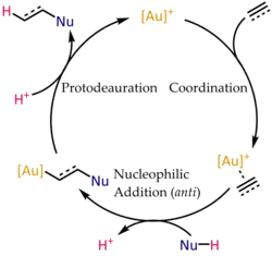 - ↑ Reetz, M. T.; Sommer, K. (2003). "Gold-Catalyzed Hydroarylation of Alkynes". European Journal of Organic Chemistry. 2003 (18): 3485–3496. doi:10.1002/ejoc.200300260.