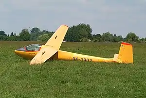 The VT-16 Orlik was designed by Jiri Matejček and is a high-wing monoplane of all-wood construction, except that the skin is stabilized with polystyrene foam. Its wing has a single spar structure with a forward torsion box; the whole wing is plywood skinned and foam filled, allowing the ribs to be comparatively widely spaced. In plan it is straight-tapered with blunt tips; there are 3° of dihedral. It has conventional plain ailerons and spoilers at mid-chord, which extend both above and below the wing. At the time of its first flight in August 1959 it was a Standard Class glider with a 15 m (49 ft 3 in) span. Later aircraft had 16 m (52 ft 6 in) and 18 m (59 ft 1 in) spans but it was the 16 m version that went into series production.[1][2]