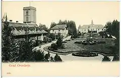 The history of the city is tightly connected with the two castles in the town of Oroslavje. Oroslavje used to have two castles, but now only has one. The castle in so-called "Gornje Oroslavje" or "Upper Oroslavje" used to belong to the Čuklins, followed by the Vranyczanys. It was almost completely destroyed in the fire of 1949 and was later demolished.[5] The only thing saved was the French-style park in front of the castle with a fountain.