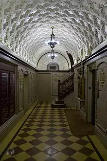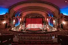 The 42 feet (13 m) high by 40 feet (12 m) wide proscenium arch is the main feature of the auditorium. The sidewalls of the auditorium were accented by niches with mock tile roofs, grills, and wood lattice arches across the ceiling to create a courtyard effect.[2]