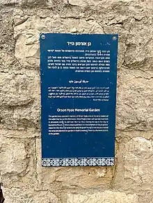 The Orson Hyde Memorial Garden on the Mount of Olives was dedicated in 1979. The park was funded by donations to the Orson Hyde Foundation through the Jerusalem Foundation. The sign at the front of the Orson Hyde Memorial Garden (see image to the right) was created by the Israeli government; however, it contains several mistakes that are common misconceptions about Hyde's mission to Jerusalem: 1) Unlike most other missions, Hyde was not called to preach the gospel in Jerusalem but to dedicate the land for the gathering of Judah,[16] and 2) Hyde was only in Jerusalem for several days, although it is true that he was traveling to and from Jerusalem during the years 1841–1842.