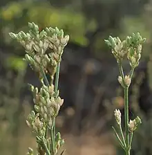 It is a ± glaucous plant, with a woody stalk. Stems up to 30(60) cm high, junciform, erect -rarely spreading-, strongly branched from the base, with rigid, angular branches, often strongly scabridged at the top. Leaves from 5-15(20) x 1-2 mm, shorter than internodes, sessile, entire, achillate, glabrous, often scabrous at margin; scarious stipules, almost setose, swollen basally in a persistent gland, purplish. Flower bracts scarious, linear-lanceolate, with scabrious margin and keel and 2 small purple glands at base. Sepals are 2-2.5(3) mm, ovate-lanceolate, ± acute, keeled and scarious on the keel, greenish, broadly margined scarious, usually sublacinate. Seeds are small, fusiform, honeyed.[6][7]