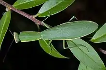 O. novaezealandiae nymphs are pale, translucent green with a dark stripe running from head to end of abdomen. As adults, they are bright green and grow to between 35 mm and 40 mm in length.[6](see note [7]) As in most mantis species, sexual dimorphism means the female is larger.[4][6]