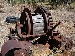 A boiler and a compressor are located in association with shafts and workings at the western end of the place. Adjacent are the remains of two small buildings constructed with flagstone surfaces and stone pitched wall sections. The purpose of these structures is not evident, although they may have been lock-up stores. The camp comprises the remains of a corrugated iron shed and a stove and fridge.[1]