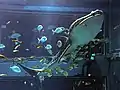 The walk-through aquarium displays marine life in several habitats comprising 27 tanks in 16 main exhibits with a total volume of 10,941 tons of water. The habitats are from the Ring of Fire area of the Pacific Ocean and these include the Aleutian Islands (tufted puffins), Monterey Bay (California sea lions and largha seals), Gulf of Panama (ring-tailed coati, long-spine porcupinefish and blotcheye soldierfish), Ecuador Rain Forest (arapaima, red-bellied piranhas, capybara & green iguanas), Antarctica (Adélie, gentoo & king penguins), Tasman Sea (Pacific white-sided dolphins) and Great Barrier Reef (palette surgeonfish, pennant coralfish & threadfin butterflyfish), Seto Inland Sea (common octopus, Japanese spiny lobster & red seabream), Coast of Chile (Japanese anchovies and South American pilchards), Cook Sea Strait (loggerhead sea turtles, deepwater burrfish & scarlet wrasse), Japan Deeps (Japanese spider crabs, elephant fish & Hilgendorf's saucord) and a jellyfish gallery (moon jellyfish & northern sea nettle).[10]