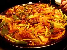 Osam-bulgogi (Korean: 오삼불고기) is a Korean dish made from squid (ojingeo in Korean) and pork belly (samgyeopsal in Korean), marinated in a blend of seasonings. The mixture is cooked over a griddle with an assortment of vegetables and mushrooms.
