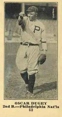 Oscar Joseph Dugey (October 25, 1887 – January 1, 1966) was a Major League Baseball player. He played all or part of six seasons in the majors, between 1913 and 1920, for the Boston Braves and Philadelphia Phillies. He played mostly at second base, but also appeared in 20 games at third base. He was a member of the Braves team during the 1914 season, which saw the "Miracle Braves" win the World Series after being in last place in July. Following his playing career, Dugey was a coach for the Braves and Chicago Cubs.