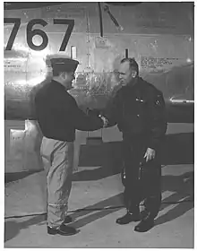He was transferred to the European Theater of Operations (ETO) in England on August 20, 1943 for active duty with the 8th Air Force. Fladmark flew combat missions with the 359th Fighter Group,[8][9] commanded by Colonel Avelin P. Tacon Jr. and based at the RAF station in East Wretham, England. Initially, the group flew the P-47 Thunderbolt fighter, which was later replaced by the P-51 Mustang fighter. Fladmark flew combat mission strikes over Munich, Saarbrücken, Regensburg, Schweinfurt, Ebelsbach, Neuaubing, Hanover, Normandy, Méry-la-Bataille, Oise River, Sens. St. Ouen and Genevilliers near Paris.[10][11] On November 2, 1944, the Associated Press wired a report on the Battle of Merseburg[12] near Leipzig, Germany. Fladmark was flying with an armada of 1100 bombers and 900 fighters when they encountered over 400 Luftwaffe fighters on the way to a combat mission near Berlin, Germany. During the Battle of Merseburg, over half of the Luftwaffe fighters were destroyed by the 8th Air Force, setting a new record.[13] Fladmark[14] completed a total of 64 combat missions over Nazi Germany and received the Air Medal with ten Oak Leaf Clusters. After his tour of duty, he was transferred to the United States on January 24, 1945. He was stationed in Santa Ana, California until war's end. Fladmark was discharged from the U.S. Army Air Corps in 1945 and returned to Sioux Falls, South Dakota. Fladmark continued his education at Augustana College and also flew with Professor Robert Branson's aerobatic team of Flandreau, South Dakota.