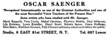 - 1 2 3 4 5 "Oscar Saenger, Baritone, 61, Dies. Noted for the Last 37 Years as Singing Teacher of This City and Washington. Many Pupils Won Fame. Swami Yogananda of India to Conduct Funeral Services Here on Tuesday Evening". New York Times. April 21, 1929. Retrieved March 3, 2015.