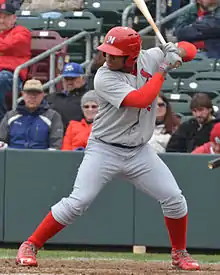 On May 30, 2014, the Cardinals called Taveras up to their MLB roster[22] in one of the most anticipated promotions in all MLB.[23][24][25] He became the first from Sosúa to reach the major leagues.[1] At that point, he had been batting .325 with a .373 OBP and a .524 SLG at Memphis. Other totals included seven HR and 40 RBI in 49 games and 191 at-bats.[26] Taveras was held hitless in consecutive games just once.[23] In his last 10 games, he collected hits in all but one, batting .462. During those same 10 games, he fashioned two three-hit games and one four-hit outing.[27] In 209 plate appearances, he walked just 14 times, but also struck out just 25 for a 12.1% strikeout rate.[24]