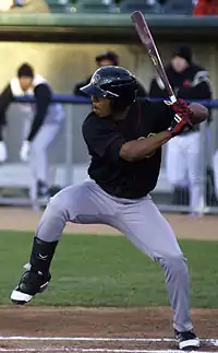 With a wide batting stance and slight leg kick that "allows him to maintain both incredible balance and timing", he shifted his weight on his left (back) leg "before connecting with the ball with an explosive, quick swing." His combination of strong, quick hands and excellent hand-eye coordination allowed him to assert considerable bat control to make constant, square contact with the incoming pitch.[37] With an ability to drive the ball to all fields, his power ceiling was high, projected with 25 to 30 home runs in his peak. His preparation also received high marks.[4] Through 2013, Taveras' career minor league batting average was .320 with 45 home runs and 275 RBIs in 374 games.[5]