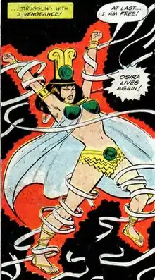 Osira was first introduced as an alien who crash-landed on Earth centuries ago. She and her husband Hefnakhti were worshipped as gods by the ancient Egyptians for their advanced technology and knowledge of irrigation. Egyptian pyramids were erected in their honor. They brought peace to Egypt but an old high priest called Anankh spoke against the couple as their sense of peace meant taking away the people's free will. Anankh trapped Osira and Hefnakhti in a pyramid, where they remained until 1942. Two opposing tanks accidentally blasted the pyramid open and Osira was released. Osira discovered that Hefnakhti had expended too much of his alien energy trying to escape the pyramid and thus he didn't have enough energy to sleep throughout the centuries and died.