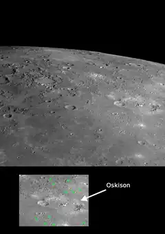 The crater Oskison is located in the far northern hemisphere of Mercury, in the plains north of Caloris basin. Oskison is a distinctive crater with a large central peak that exposes material excavated from depth. Many chains of secondary craters are visible radiating from Oskison outward onto the surrounding smooth plains, known as Stilbon Planitia.[1]
