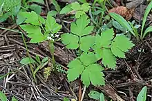 The green leaves have blades up to 12 centimeters wide which are divided into toothed or deeply lobed leaflets. The blade is borne on a long petiole.