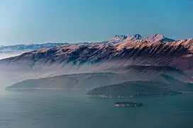 ![]() View of Ostrovicë from Mt. Pelister and Lake Prespa in the foreground | |