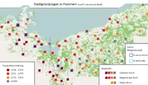 Between 1234 and 1299, 34 towns[30] were "founded"[32] in the Pomeranian duchy, this number increased to 58 in the late Middle Ages.[30] The towns were built on behalf of the Pomeranian dukes or ecclesiastic bodies like monasteries and orders.[33] Most prominent on this issue was Barnim I of Pomerania-Stettin, who since was entitled "the towns' founder". The towns build on his behalf were granted Magdeburg Law and settled predominantly by people from the western Margraviate of Brandenburg, while the towns founded in the North (most on behalf of the Rugian princes and Wartislaw III of Pomerania-Demmin were granted Lübeck Law and were settled predominantly by people from Lower Saxony. The first towns were Stralsund (Principality of Rügen, 1234), Prenzlau (Uckermark, then Pomerania-Stettin, 1234), Bahn (Knights Templar, about 1234), and Stettin (1237/43), Gartz (Oder) (Pomerania-Stettin, 1240), and Loitz (by Detlev of Gadebusch, 1242). Other towns built in the 1240s were Demmin, Greifswald (by Eldena Abbey), Altentreptow.[34]
