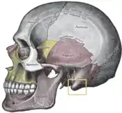 The undersized development of one side of a person's face, demonstrates the influence of skeletal development upon the position of the external ear on the head, as caused by the deficient morphologic development of the temporal bone, and by the medial positioning of the temporomandibular joint, the synovial joint between the temporal bone and the mandible (upper jaw). Moreover, in severe cases of hemifacial microsomia, without the occurrence of microtia (small ears), the normal external ear might appear to have been sheared off the head, because the upper half of the pinna is projecting outwards, and, at the middle point, the lower half of the pinna is canted inwards, towards the hypoplastic, underdeveloped side of the face of the patient. A similar type of asymmetric development of the head and face features a relatively broad head, a narrow face, and a narrow mandible; when observed from the front perspective, the head and face of the person present a triangular configuration. Such wide-to-narrow skeletal sloping, from the head to the face, might create the bone promontory upon which rests and from which projects the upper anatomy of the pinna, which otherwise is an external ear of normal proportions, size, and contour.