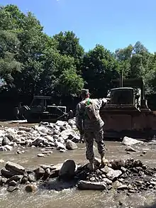Then in mid to late June 2013, severe flooding was experienced along the entire creek. The flood of 2013 flooded downtown Fort Plain and extended all the way up the creek to Van Hornesville. Police officers who were knocking on doors when the water was rising got cut off. Resients were unable to get off Abbott Street, which is a dead end road, and escaped up a small hill on the opposite side of creek. A culvert was damaged on Chyle Road and the Owen D. Young Central School was damaged in Van Hornesville. Part of State Route 80 between Van Hornesville and Starkville was entirely washed out. Large amounts of sediment were also carried downstream and deposited which caused flooding to be worse. One fatality was reported in this storm. On July 3, 2013, Senator Charles E. Schumer visited the area and called for quick action from the federal government. A mix of NYSDOT crews, a half-dozen contractors and the National Guard worked to restore the stream bed and roads. In mid July, at the restoration project's peak, there were more than 300 workers on the project.[16][18][19]