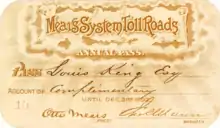 Mears built several railroads during his 91 years, including the Rio Grande Southern Railroad from Durango to Ridgway, the Silverton Railroad, and the Silverton Northern Railroad. Several of his railroads were narrow gauge. From 1888 to 1892, Mears issued special railroad passes to dignitaries and friends to allow them to ride free on any of his lines.[12] Some of these rare passes were made of silver or gold and are now highly prized collectors' items. A Master List of all of the presently known Otto Mears unique passes for the Silverton Railroad and the Rio Grande Southern Railroad is on line at San Juan County Historical Society.org under "Mears Passes".