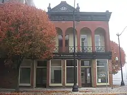 Otto Schlemmer Building is a historic commercial building located at Crawfordsville, Montgomery County, Indiana. It was originally built in 1854, and renovated to its present form in 1889. It is a two-story brick building with wood and pressed metal trim. The front facade features an arcade of six two-story, round-headed brick arches that form a gallery at the second level. The use of the Roman arch, denticulated frieze, bracketing, and a projecting central pediment are reflective of the Victorian Renaissance style.[2]:2,5
