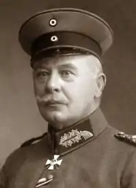 During World War I he served as a division- and corps-level commander of Imperial German troops. He was in command of 4th Cavalry Division, which was part of the force that moved into neutral Belgium to invest the fortress city of Liege.[1][2] He was severely wounded at Ciechanów on 21 November 1914. In August - September 1915, at the head of the cavalry corps, he led the Sventsyansky breakthrough (Конница в Виленской операции 1915-го). He was awarded with a Pour le Mérite on 17 October 1916.[3] He replaced Erich von Gündell as a commander of V. Reservekorps and Franz von Soden as a commander of VII. Reservekorps.[4][5] Garnier retired from active duty in March 1918. His daughter Huberta had married General of the Infantry Dietrich von Choltitz.[6]