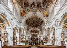 From 1711–1725, Rupert erected the present monastery, the architectural grandeur of which has merited for it the name of "the Swabian Escorial", attesting to the economic significance of the abbey. It was famous for its book illuminations.[7] The abbey library features stucco ceilings by Johann Baptist Zimmermann and ceiling paintings by Elias Zobel.[8]